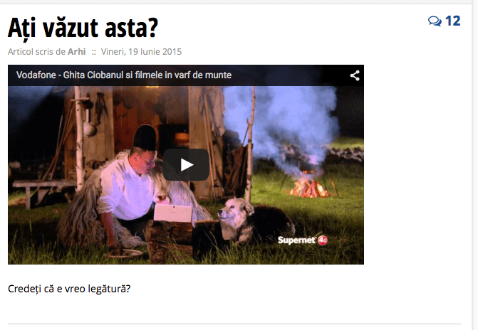 Ieri Vodafone a scos la mezat o noua reclama in care apare Ghita Ciobanul. Din pacate pentru romanii de rand vanatoarea asta de talente si de „povesti adevarate” a Vodafone s-a oprit la Ghita Ciobanul, la unu’ cu o florarie online si altul de s-a dus la Bucuresti sa cante si cam atat. Alte „povesti adevarate” nu mai exista in Romania si tocmai de aceea din lipsa de alternative cei care se ocupa cu PR-ul Vodafone n-au alta optiune decat sa recurga la ciorba reincalzita. Sa-l surprinda din nou pe Ghita Ciobanul la stana si sa se agate de ceea ce pare sa fie subiectul momentului, adica un serial oarecare difuzat de HBO.