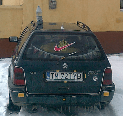 Probabil ca orice comentariu pe marginea masinii e de prisos. Imaginea face cat 1000 de cuvinte. Omul a pus pozele astea intr-un anunt de vanzare, pentru ca asa se vinde o masina. Murdara, cu sticla de 2 litri de benzina pe plafon si cu celebrele bling-uri de cocalar pe ea…