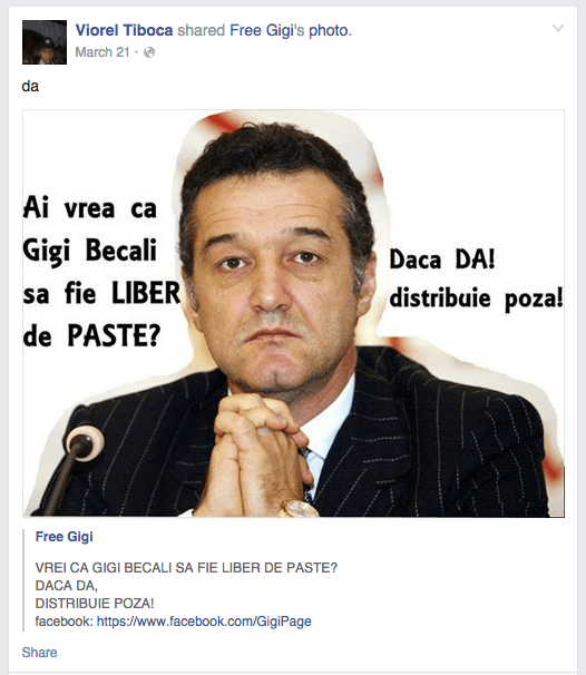 Apoi nelipsit de pe wall-ul oricarui simpatizant PSD si BOR e Gigi Becali, cu celebrul „Free Gigi”.