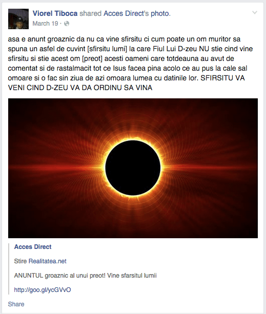 Evident ca din arsenalul de postari al unui astfel de om nu pot sa lipseasca stirile privind sfarsitul lumii, de asemenea insotite de comentariul agramat.