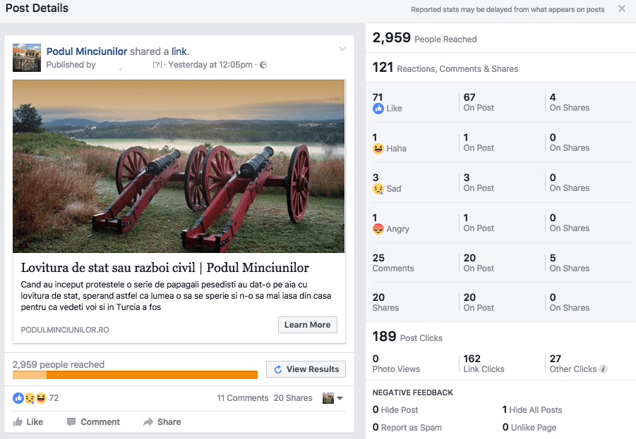 Reachul total de 2959 se datoreaza celor 20 de shareuri pe care le-a primit articolul si cum mai bine de jumate dintre ele au fost date cu setari private n-am putut sa le analizez pe toate per ansamblu si o sa sar peste asta.