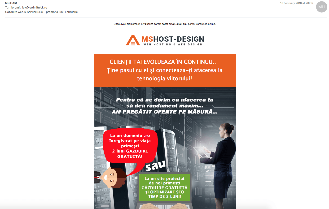 Primesc in urma cu cateva luni un mail de la MSHost pe o adresa ce n-a mai fost folosita de cel putin 10 ani urmatorul spam: