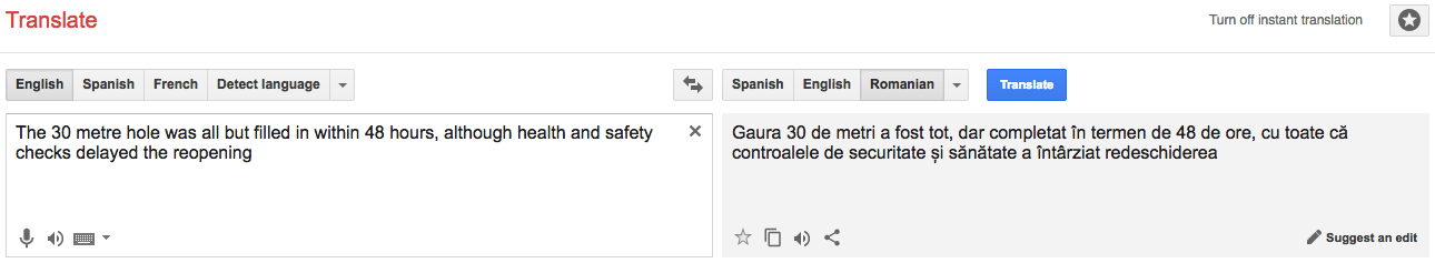 Titlul de pe The Guardian specifica cat se poate de clar si raspicat faptul ca strada s-a redeschis la o saptamana dupa incident in timp ce subtitlul mentioneaza in trecere faptul ca groapa de 30 de metri a fost umpluta in 48 de ore fara sa mai existe vreo referinta la intervalul de 48 de ore in articol.