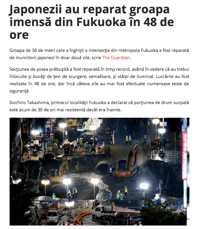 Cred ca mai toata lumea a aflat faptul ca intr-un oras oarecare din Japonia intr-o dimineata (adica pe 8 noiembrie 2016 in jurul orei 5:00 – ora locala) s-a surupat o intreaga intersectie, lucru ce a privat de utilitati un numar considerabil de locuinte si a pus in dificultate traficul rutier si feroviar din zona.