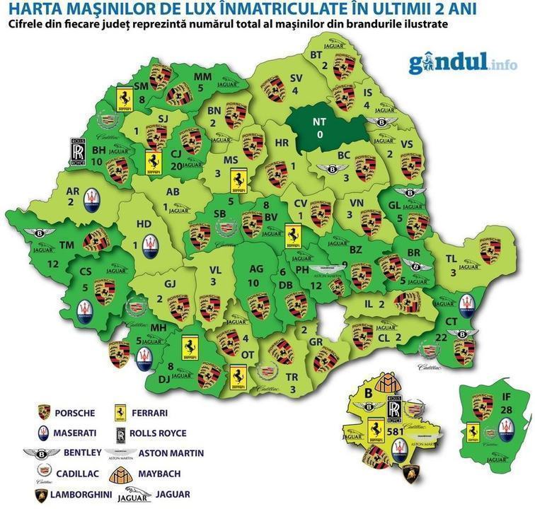 - Harta masinilor de lux inmatriculate in Romania anului 2012