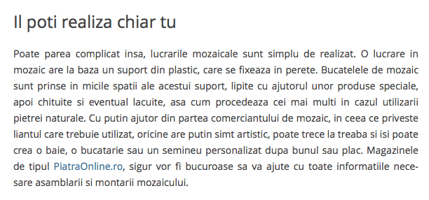 Totusi, aseara ma dadeam pe diverse bloguri si pe blogul unei doamne sau domnisoare, unde in mod normal ar trebui sa gasesti articole despre moda, cosmetice, frumusete si alte chestii femeiesti am dat peste un articol intitulat „Patru motive pentru care sa alegi mozaicul ca material pentru finisaje moderne durabile”.