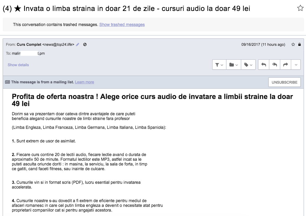 Cred ca inainte sa ne plangem de spamul re-targetat e musai sa vorbim de spamul ne-targetat, ala care se face in bulk si se trimite pe diverse adrese de email fara sa existe macar o minima posibilitate ca acestea sa genereze un fel de engagement pozitiv, ca negativ sigur genereaza.