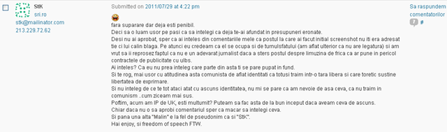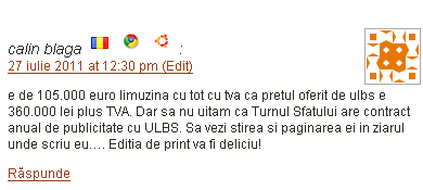 STK: Desi nu ai aprobat, sper ca ai inteles din comentariile mele ca postul la care ai facut initial screenshot nu iti era adresat tie ci lui calin blaga. Pe atunci eu credeam ca el se ocupa si de turnulsfatului (am aflat ulterior ca nu are legatura) si am vrut sa ii reprosez faptul ca nu e un adevarat jurnalist daca a sters postul despre limuzina de frica ca ar pune in pericol contractele de publicitate cu ulbs.