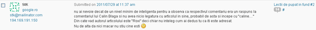 Ei bine pana aici toate bune, intr-adevar as putea sa-mi fac mea culpa si sa recunosc ca am gresit tinand cont ca intr-adevar Calin a postat inaintea lui comentariul si i l-as fi aprobat daca nu ar fi folosit limbaj de “intelectual”